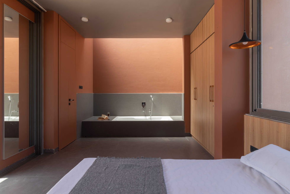 The floating roof design generates a captivating mix of covered and semi-covered spaces. The covered areas serve as habitable spaces that flow seamlessly into the farms through expansive verandas. The grid pattern of the parallel walls incorporates smaller service spaces and larger served spaces. The northern side of the built opens into the internal courtyard, providing private and sleeping areas. On the other hand, walls extending towards the longitudinal side open into the farmland, creating a common family area encompassing the living, kitchen, and dining spaces.